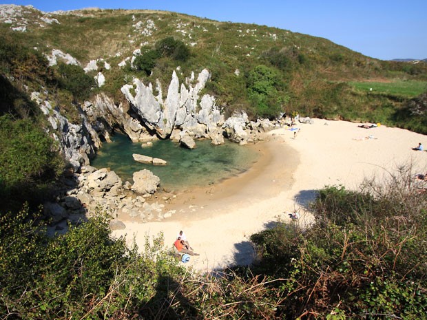 Localizada a cerca de 100 metros de distância da costa, a praia fica no meio de um prado, cercada por plantações agrícolas, na região das Astúrias.
