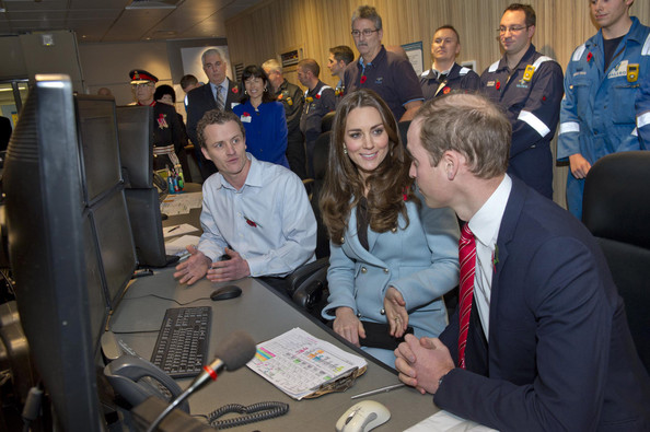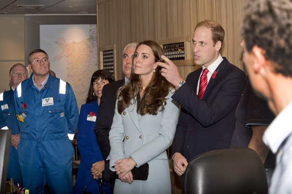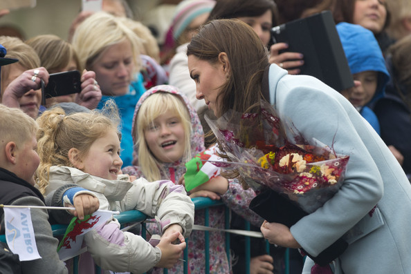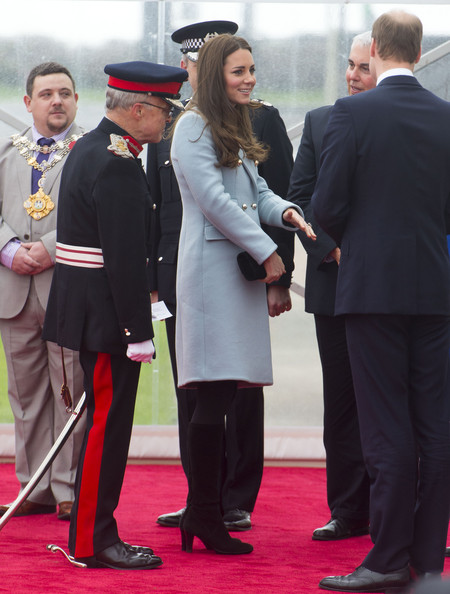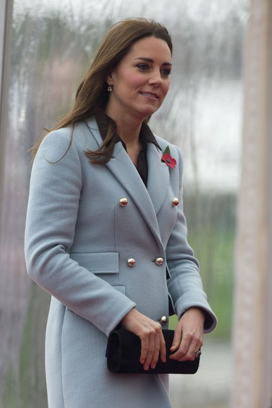 Para a ocasião, Kate optou por usar um casaco azul claro pelos joelhos, de Matthew Williamson, que conjugou com botas altas pretas. O look ficou completo com uns brincos Kiki McDonough.
