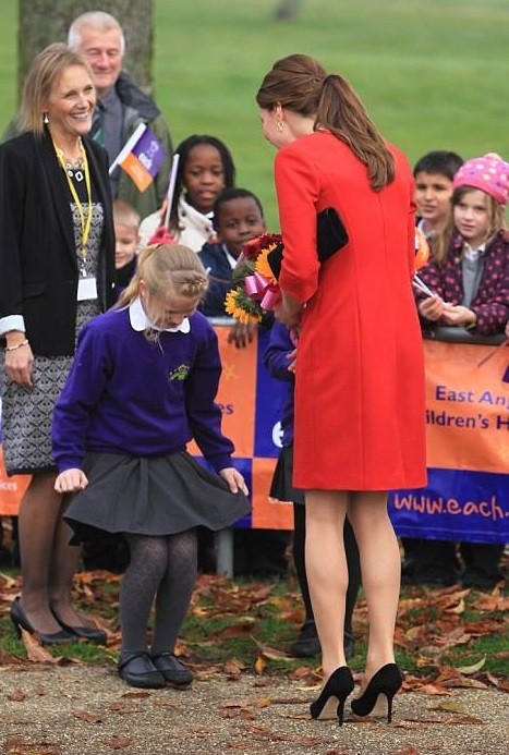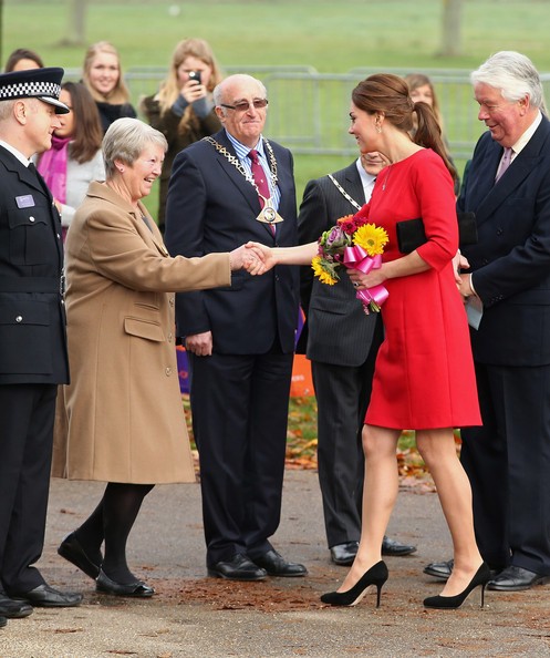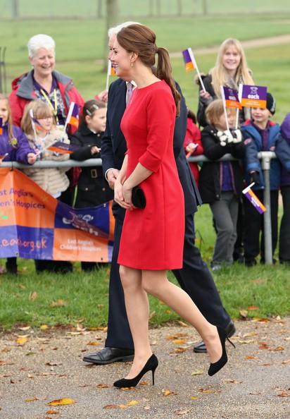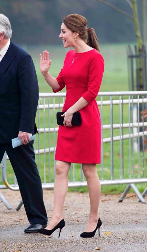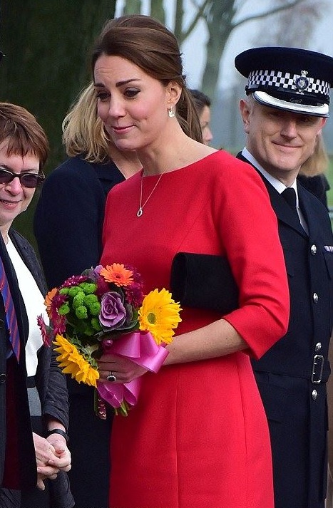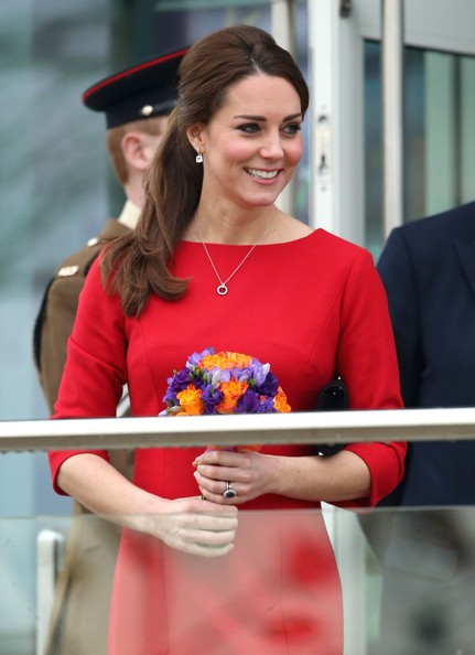 Para a ocasião, a duquesa elegeu um elegante vestido vermelho da estilista britânica Katherine Hooker, que evidenciava a sua barriga de quatro meses de gravidez. Além da elegância do look, Kate chamou à atenção por ter optado por fazer um apanhado no cabelo que é considerado uma das tendências da estação, mostrando que não é por acaso que é considerada um dos ícones de moda.