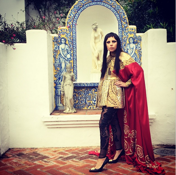 Gaga vestiu o look em Espanha e partilhou imagens nas redes sociais: “Obrigada pelo maravilhoso fato feito especialmente para mim em Lisboa. (…) Uma capa glamourosa para limpar lágrimas apaixonadas”.