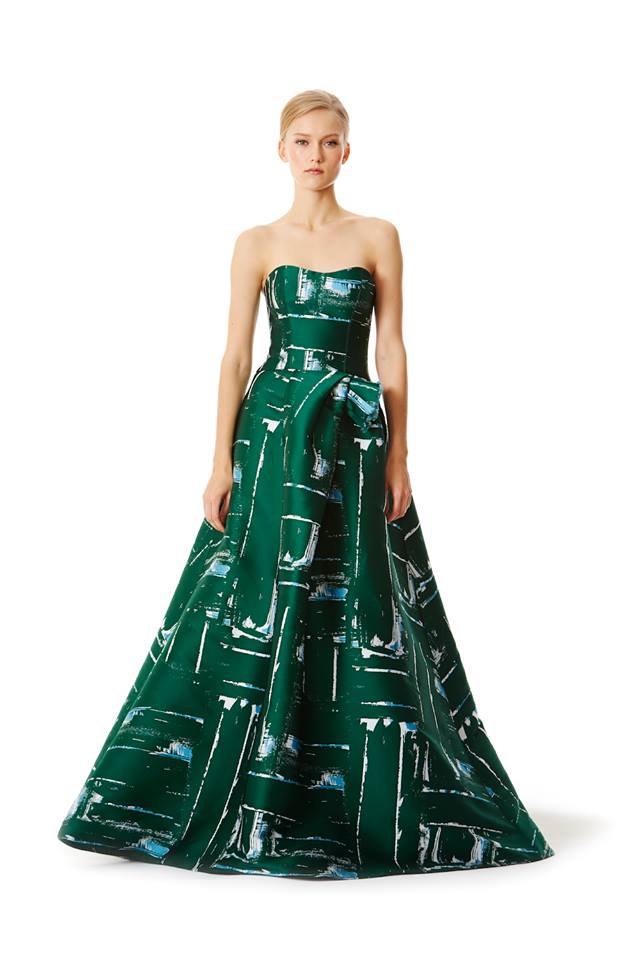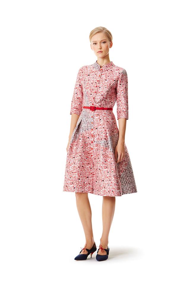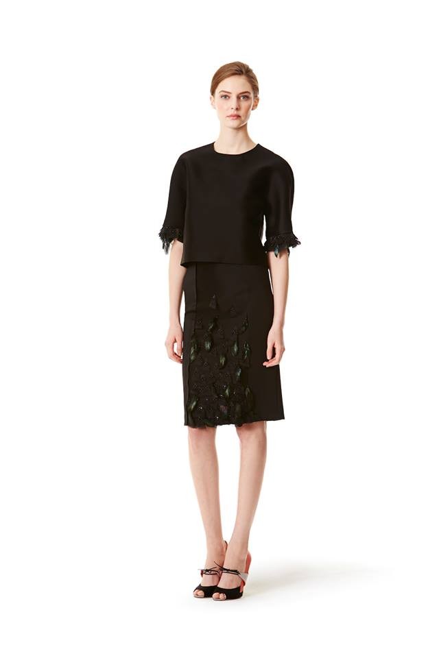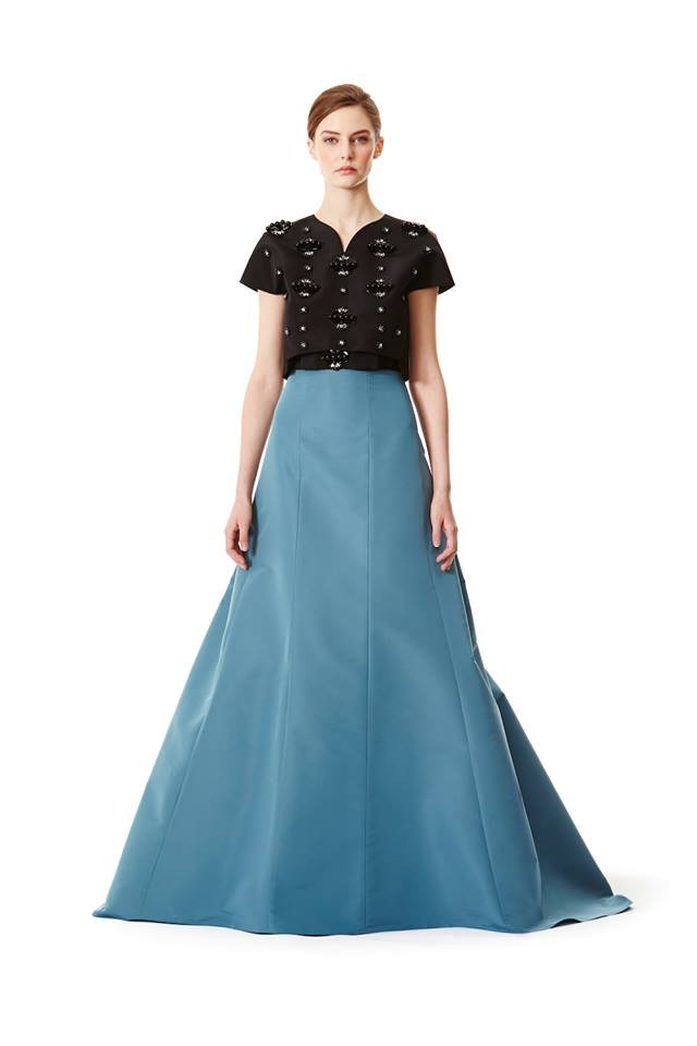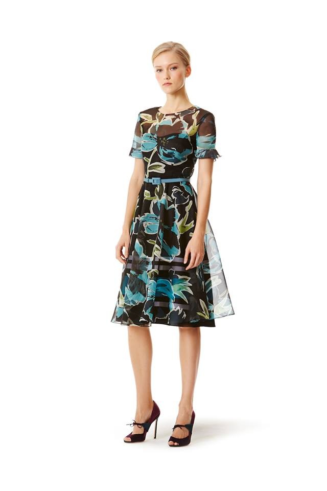 Entre as propostas, Herrera apresenta uma seleção de combinações day wear, com saias e tops, que também podem ser usadas à noite. Os florais da estilista continuam a ser destaque, mas nesta coleção também surgem peças lisas. A criadora apostou numa palete de cores sóbrias com destaque para preto, branco e cinza. O vermelho, outra de suas marcas registadas, surge em detalhes.