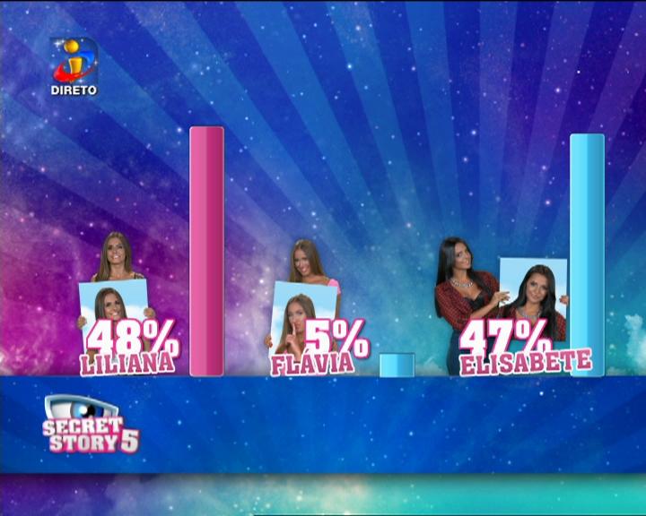 Com apenas 1% de diferença em relação a Elisabete, Liliana foi a escolhida para ser expulsa na noite de domingo, dia 14, do reality show da TVI com 48% dos votos. Seguiu-se Elisabete com 47% e bastante mais longe ficou Flávia, arrecadando apenas 5% da votação final dos portugueses.