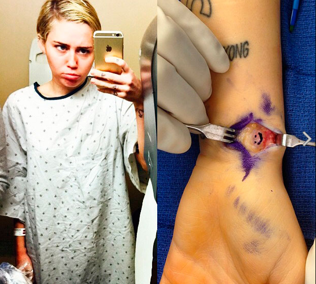 As últimas imagens que Miley Cyrus publicou nas redes sociais pode ferir a suscetibilidade de algumas pessoas. A cantora, de 22 anos, publicou no Instagram fotos em que mostra o seu pulso aberto durante o que parece ser uma cirurgia.