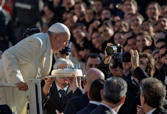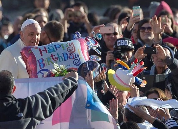 Francisco foi saudado ao longo do percurso no papamóvel na Praça de São Pedro, onde várias pessoas tinham mensagens de felicitações e postais de aniversário gigantes. O líder da Igreja Católica esteve junto a um grupo de padres e seminaristas, com uma bandeira argentina, dos quais recebeu um bolo e o tradicional mate.
