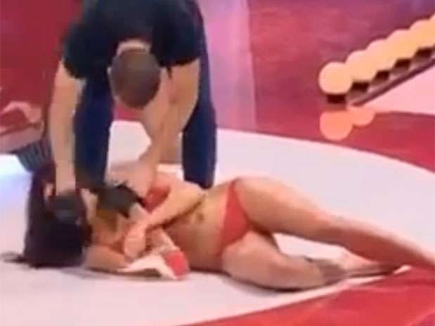 Uma mulher foi violentamente agredida por um concorrente rival durante um concurso televisivo, alegadamente na Rússia. As imagens estão a gerar polémica.