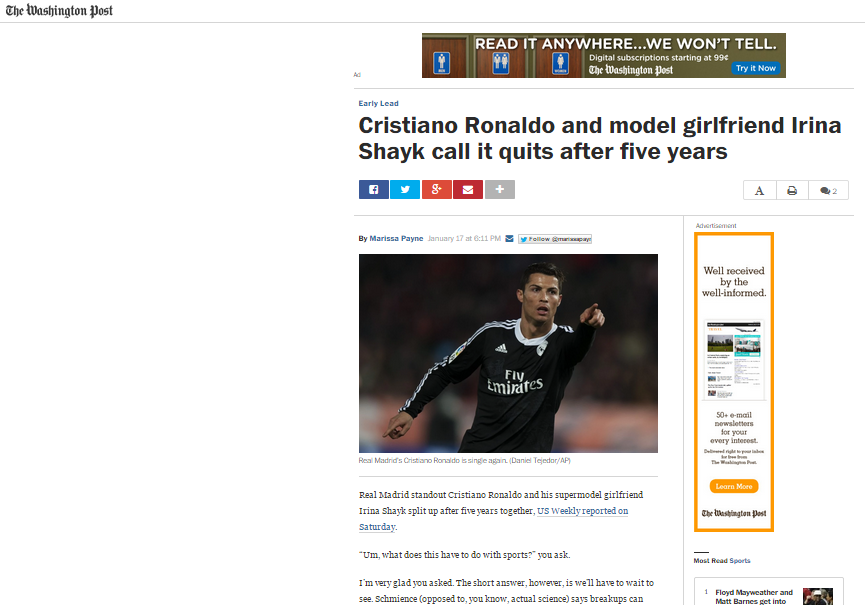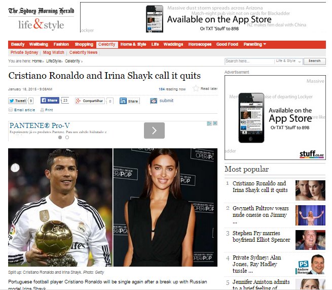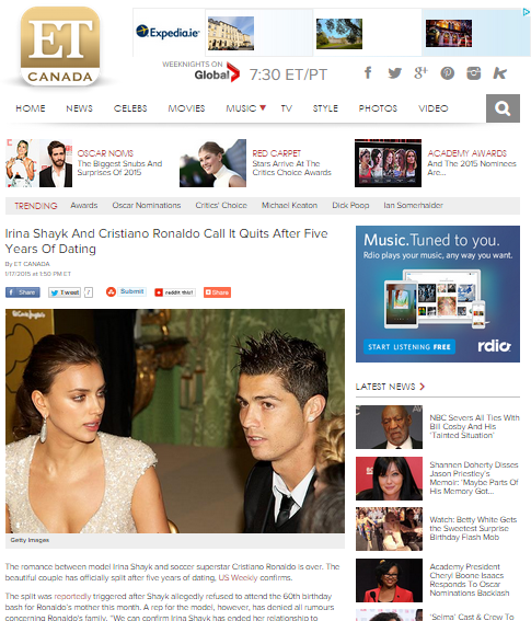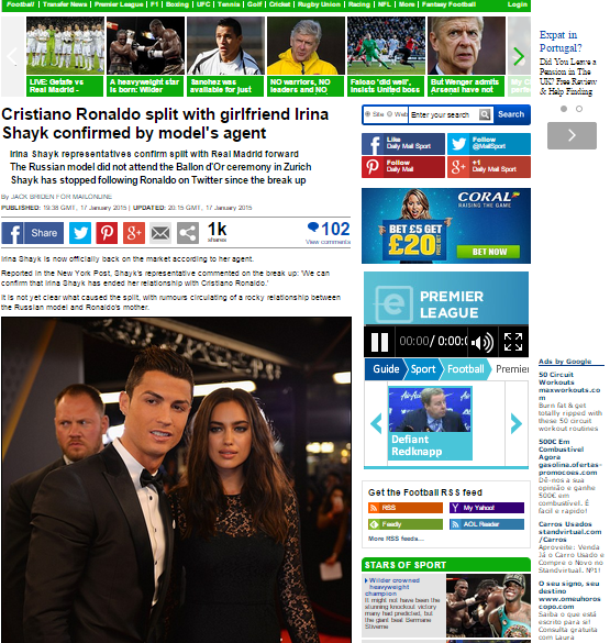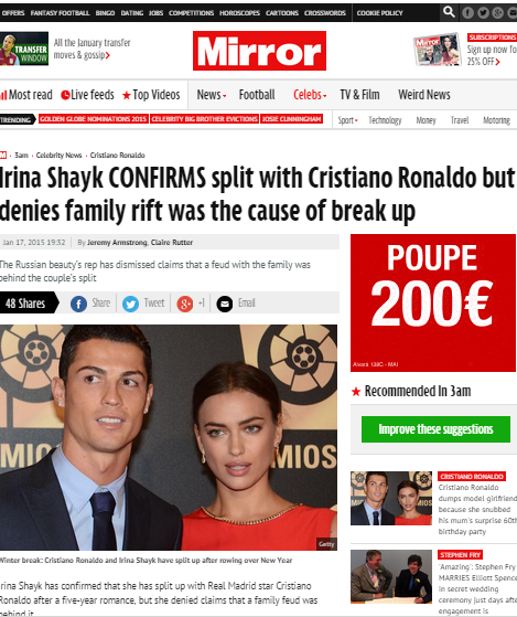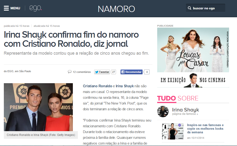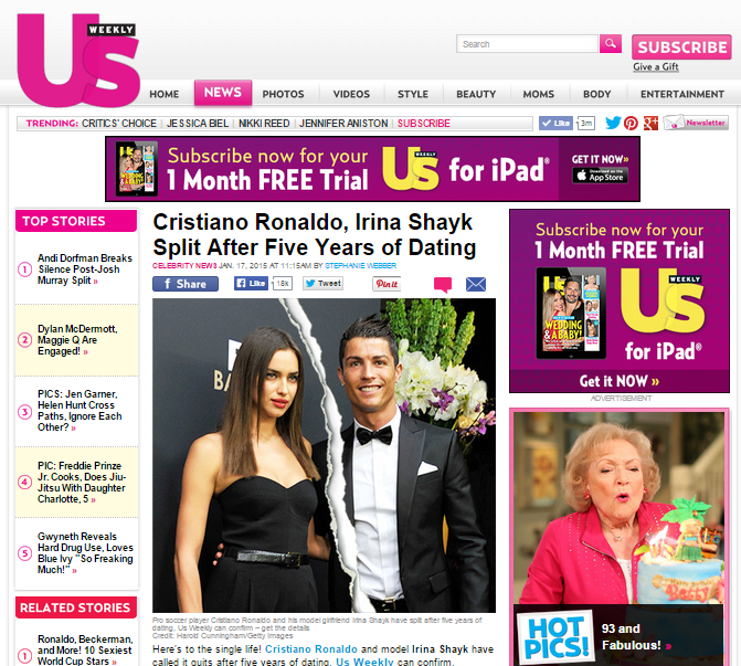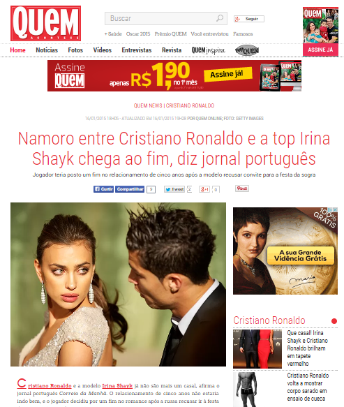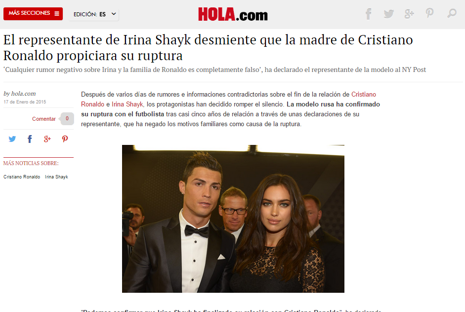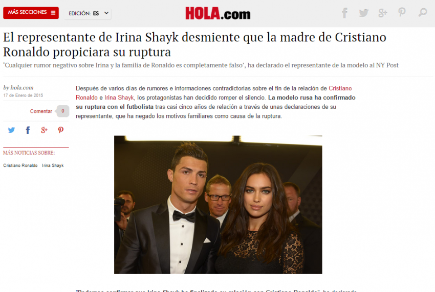 A “US Weekly” escreveu que os dois estão “solteiros” e que Ronaldo, antes de namorar com Irina, já tinha sido associado a nomes como Paris Hilton, Kim Kardashian e Maria Sharapova. Já o “Daily Mail” realça que foi a modelo quem colocou um ponto final na relação.