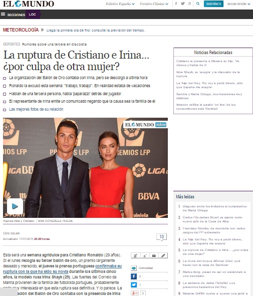 Na vizinha Espanha, a notícia foi destaque na revista “Hola”, que salienta o facto de não ter sido Dolores Aveiro a causa do final do namoro. O “El Mundo” deixa no ar a hipótese de que a relação terá terminado devido à existência “de outra mulher” – possivelmente Nieves Álvarez – que a decisão final foi do jogador e não de Irina.