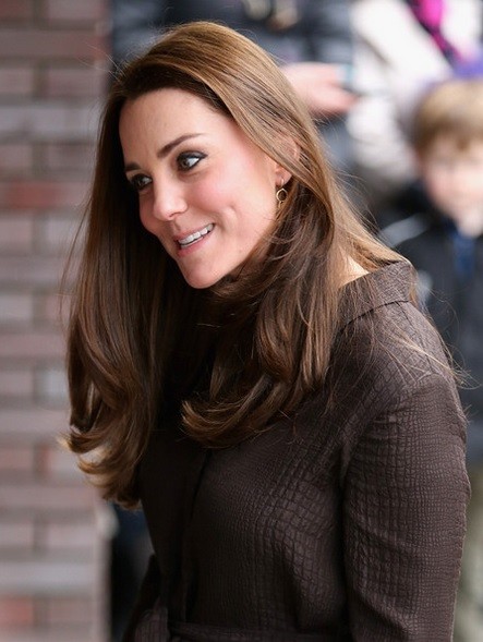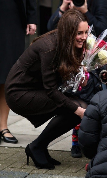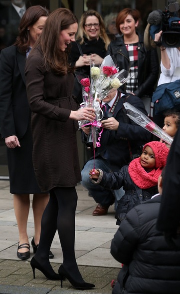Grávida de seis meses do segundo filho, a mulher do príncipe William surgiu sorridente e foi acolhida de forma calorosa por várias crianças, que a presentearam com várias flores.