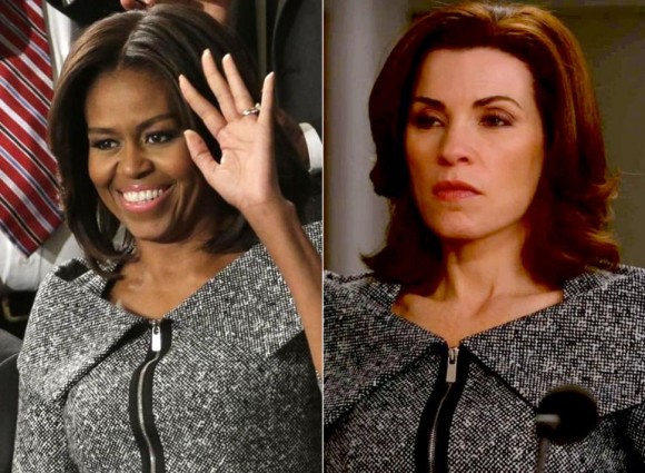 Michelle Obama recebeu muitos elogios pelo look escolhido para o evento, um tailleur cinza da coleção outono/inverno 2013 do criador norte-americano Michael Kors. O modelo está a dar que falar, já que se trata do mesmo conjunto usado pela atriz Julianna Margulies num dos episódios da quinta temporada da série “The Good Wife”, onde dá vida a Alicia Florrick.