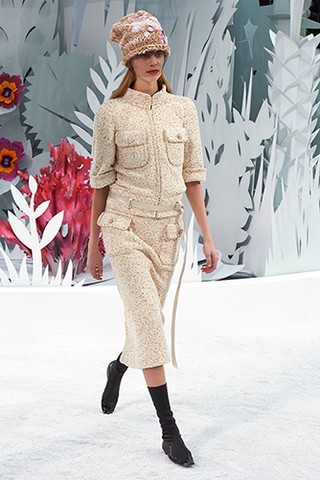 As jaquetas cropped ou tops e saias midi foram as peças que estiveram em destaque. O famoso estilista escolheu ainda cores fortes para compor a coleção como o laranja, o azul, o verde e o amarelo.