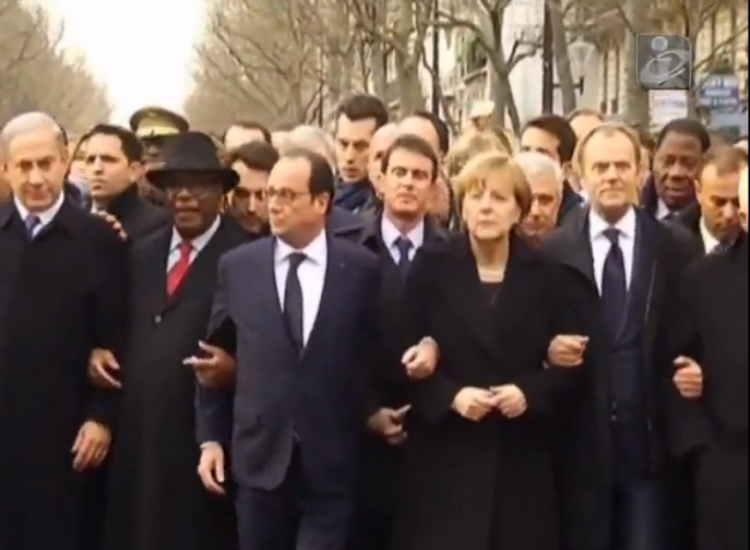 O cortejo foi comandado por dezenas de líderes mundiais – Chefes de Estado, de Governo e representantes políticos e diplomáticos de dezenas de países, entre os quais Passos Coelho, Assunção Esteves, Angela Merkel, Mariano Rajoy, David Cameron, Benjamin Netanyahu e Mahmoud Abbas – estiveram de braço dado com o 24º Presidente da França, François Hollande.
