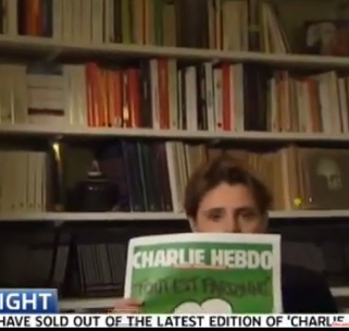 Durante a emissão do programa “Sky News Tonight”, na noite de quarta-feira, dia 14, Caroline Fourest, jornalista de “Charlie Hebdo”, falava em direto de Paris e reclamava por os órgãos de comunicação social britânicos não divulgarem a capa do jornal que ontem voltou às bancas. Durante a sua intervenção, pegou num exemplar e virou-o para a câmara. A Sky rapidamente retirou-a do ar.