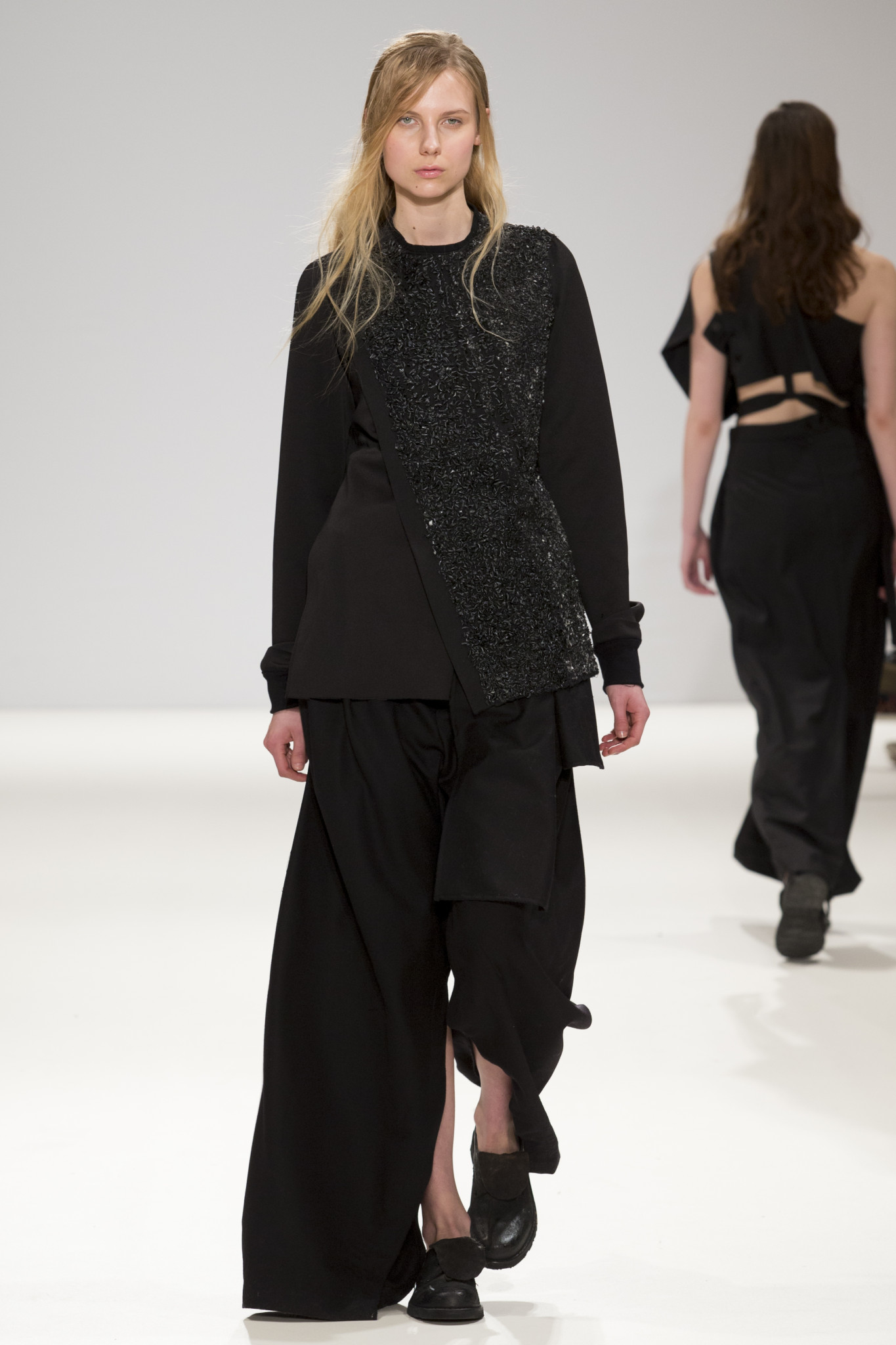 Com elementos clássicos masculinos reinterpretados e desconstruídos, a criadora aposta em cores em base, negras, iluminadas por brancos.