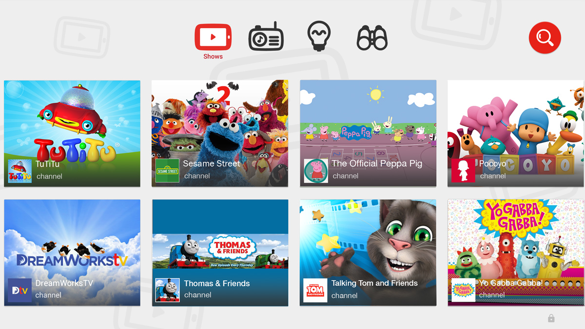 A YouTube Kids é uma versão simplificada do site original e está dividida em quatro categorias: espetáculos, música, aprender e explorar.