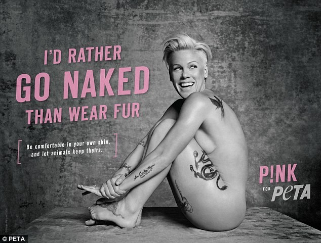 A irreverente cantora aceitou posar nua em defesa dos animais. Pink, de 35 anos, surge sem roupa na nova campanha da PETA, associação de defesa dos animais. “Eu prefiro ficar nua do que vestir pele. Fique confortável na sua própria pele e deixe os animais continuem com as (peles) deles”, lê-se no cartaz.