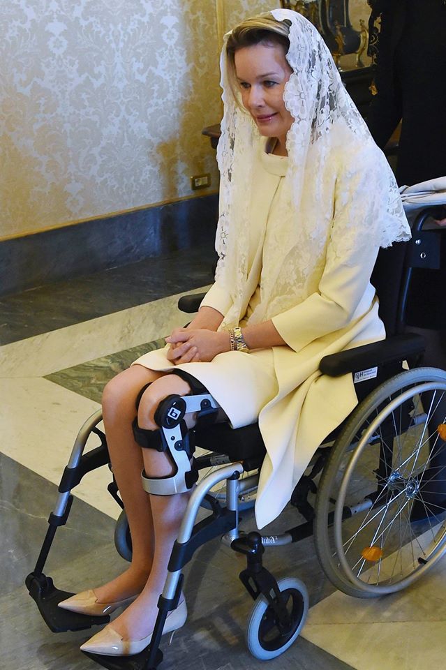 Mais uma vez a rainha surgiu de cadeira de rodas e com muletas, depois de há uns dias ter sofrido uma queda que causou uma lesão no seu joelho esquerdo. Apesar da lesão, a monarca não tem abrandado e tem cumprido a sua agenda oficial.