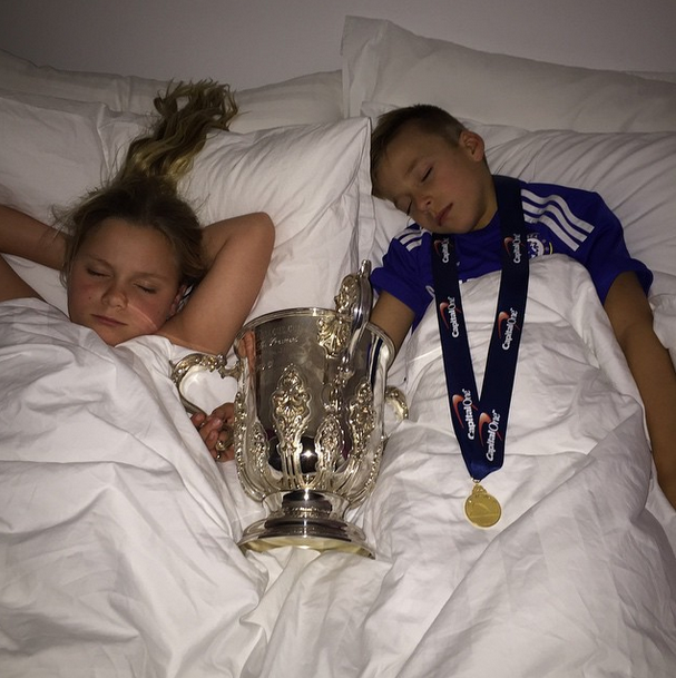 Nas redes sociais, o jogador revelou onde pernoitou a taça. Terry publicou uma fotografia no Instagram onde se vê os seus dois filhos, Georgie e Summer, num sono profundo na cama… e com o troféu no meio.