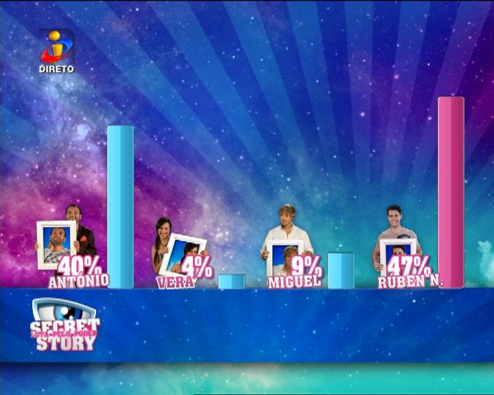 Rúben N. foi o escolhido pelos portugueses, com 47% dos votos, para abandonar o reality show. António teve 40% da votação, Miguel teve 9% e Vera, 4%.