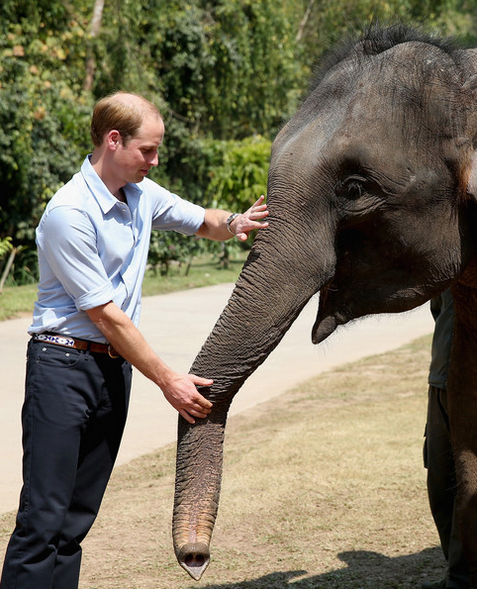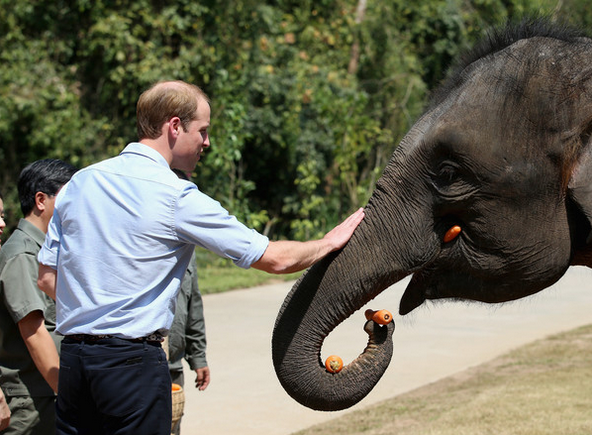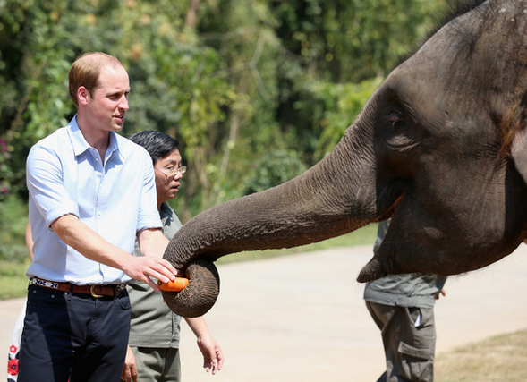 O duque de Cambridge mostrou-se fascinado pelos animais e manteve-se junto a Ran Ran, um elefante de 13 anos que foi encontrado na selva com uma perna ferida, devido a uma armadilha. William alimentou-o com cenouras e não resistiu em fazer alguns carinhos ao animal.