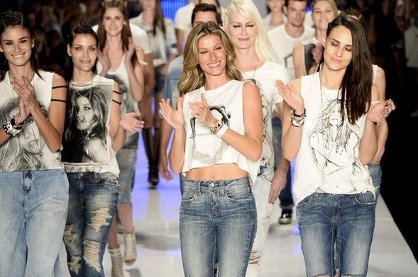 Gisele Bünchen, de 34 anos, pisou a passarelle no desfile da Colcci, na semana da moda de São Paulo. A modelo não conseguiu conter a emoção e chegou a levar a mão ao rosto para conter as lágrimas. No momento final, todas as manequins pisaram a passerelle com um t-shirt com o rosto da top estampado.