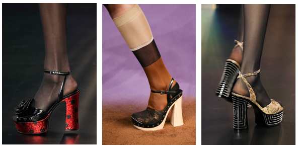 Sandálias com cores fortes e inspiração futurista, com junções aparentemente estranhas de cores e materiais, fazem destes modelos um charme, para usar e abusar nos dias mais quentes do ano. Entre várias marcas de renome internacional destaco a Miu Miu que nos leva numa viagem aos anos 70, com linhas e cores características da época.