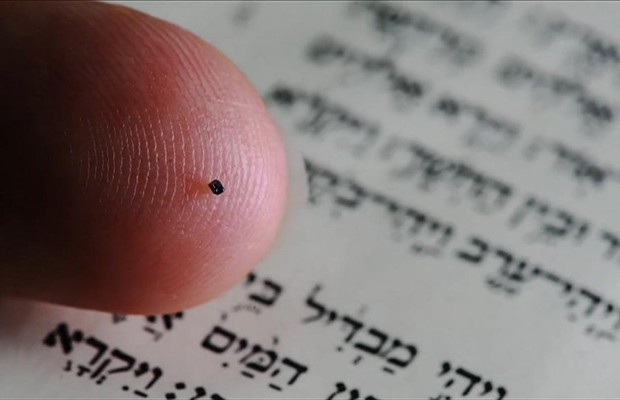 Uma cópia da Bíblia hebraica do tamanho de uma cabeça de alfinete está exposta no Museu de Israel, em Jerusalém. A nano Bíblia – a mais pequena versão do livro religioso no mundo – contém 1,2 milhão de carateres esculpidos num chip envolto em ouro.