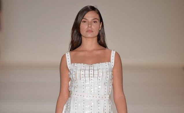 O modelo com o qual Ísis desfilou tinha várias aplicações metálicas e é um vestido de noiva fora do comum.