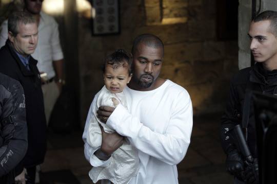 Centenas de fãs cumprimentaram o casal quando saíram do carro com a filha North, 21 meses, ao colo. Kim usava um vestido bege e dourado, enquanto o marido e a filha estavam de branco.
