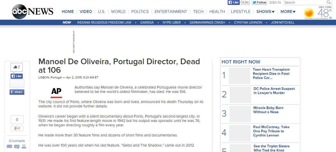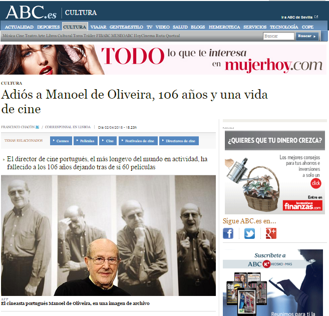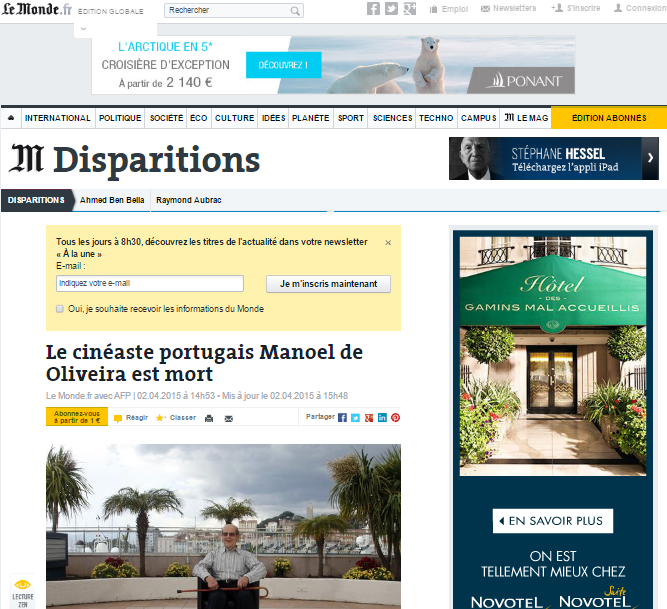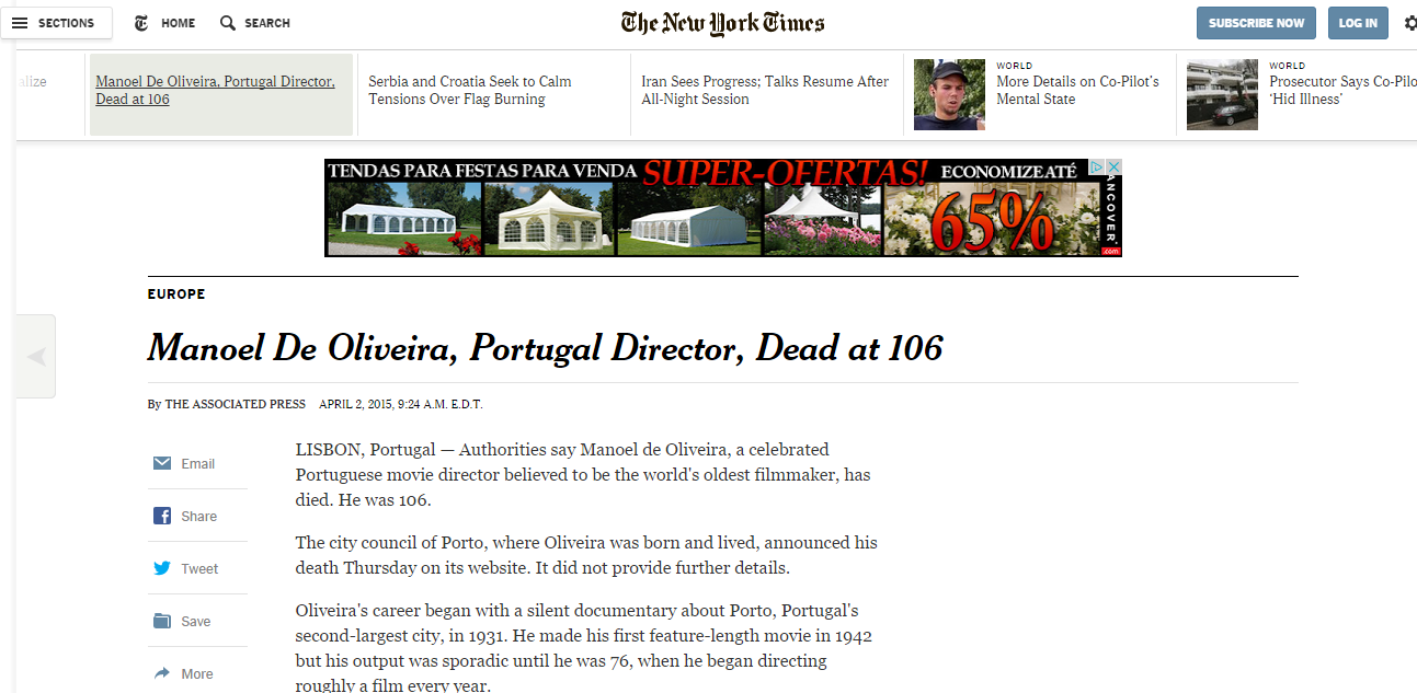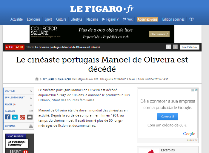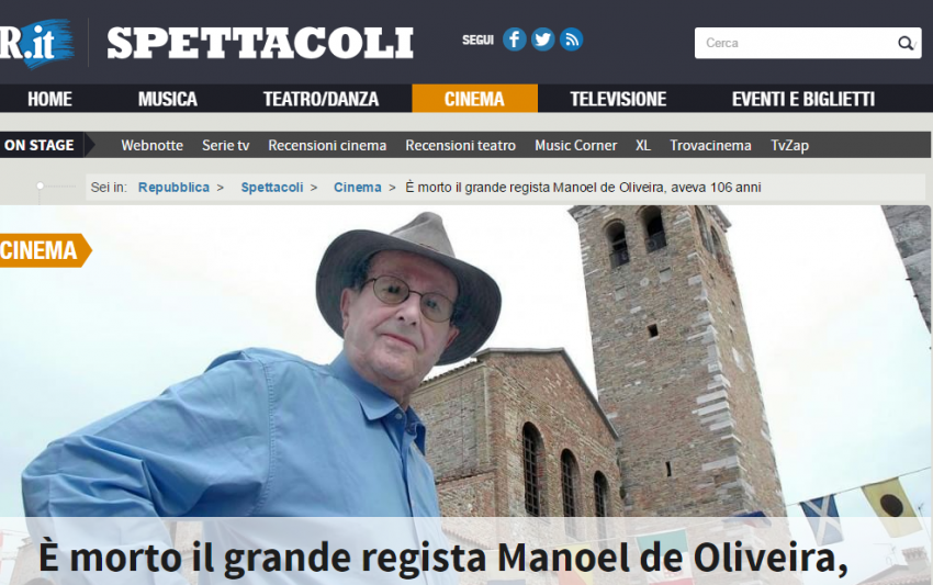 Manoel de Oliveira morreu esta quinta-feira, dia 2, e a notícia já começou a correr mundo. Os jornais estrangeiros, nas respetivas edições online, já começaram a dar destaque ao desaparecimento do “Mestre”.