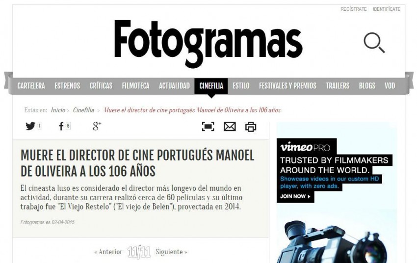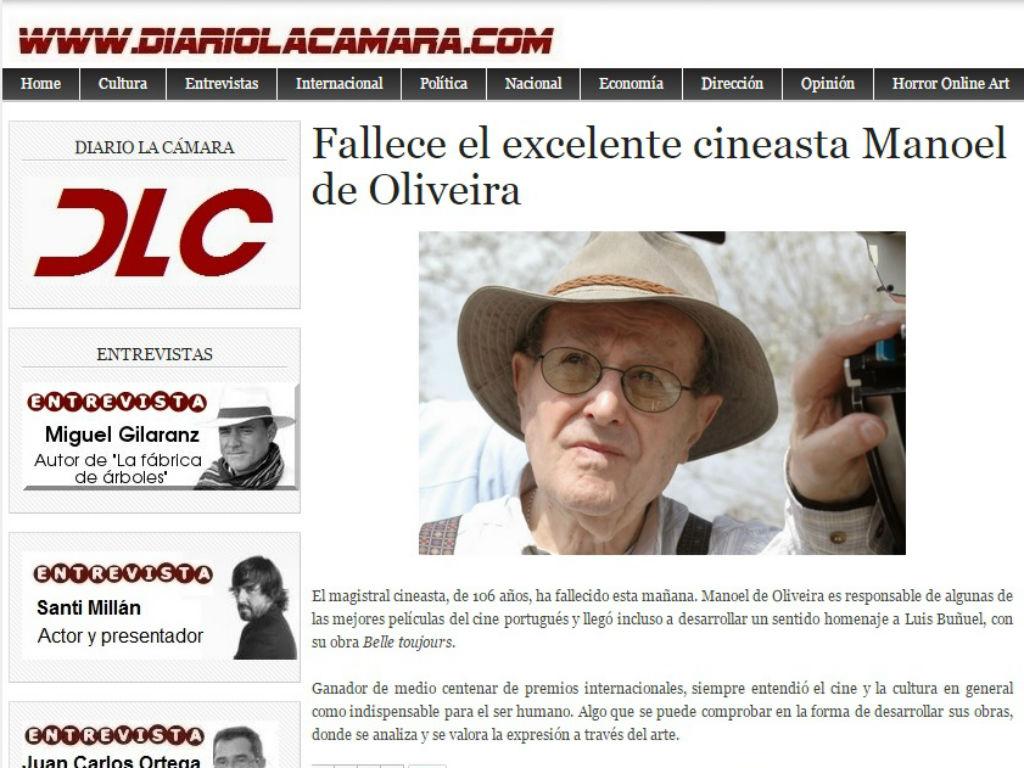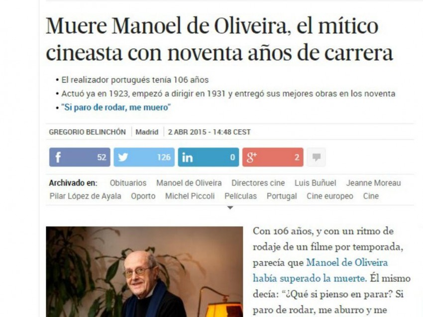 “Parecia que Manoel de Oliveira tinha superado a morte”, escreve o “El País”, que refere que o realizador mantinha o ritmo de rodagem de um filme por ano.