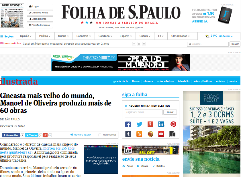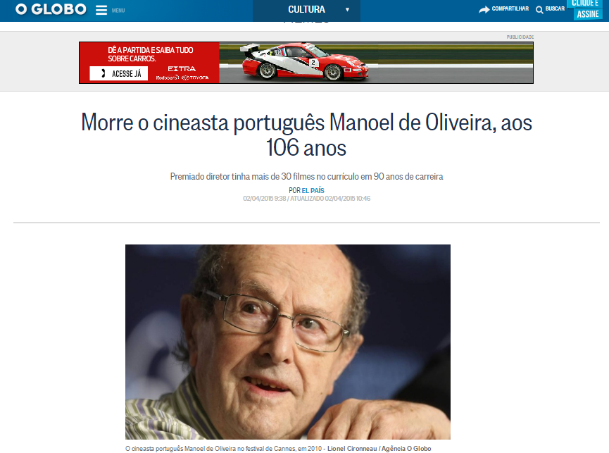 A longevidade do cineasta é o tema destacado em quase todas as notícias, tanto na Europa, como no Brasil ou nos Estados Unidos.