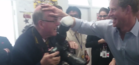 O príncipe estava a pintar a palma da mão para deixar a sua marca na parede da associação Turn Your Life Around Trust, quando, surpreendendo todos os presentes, marcou a sua mão pintada de roxo na cabeça do fotógrafo. O momento divertido, que foi registado em vídeo, provocou risos e gargalhadas em todos os presentes.