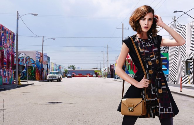 A manequim britânica posou pela quarta vez para a Longchamp, desta vez para a campanha de outono 2015. Alexa Chung foi fotografada por Max Vadukul, em Wynwood, Miami, um bairro conhecido por ser muito colorido.