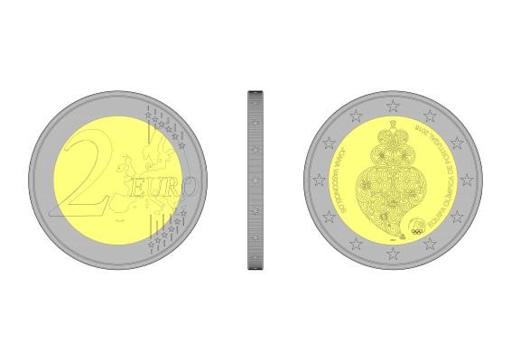 Já a moeda corrente comemorativa de 2 euros reproduz uma das obras mais icónicas de Vasconcelos – Coração Independente Vermelho – apresentando-se como um elogio ao espírito de determinação, trabalho e paixão que caracteriza o povo português e, em especial, os atletas que nos irão representar nesta competição. Esta moeda estará em circulação e terá, ainda, uma produção limitada.