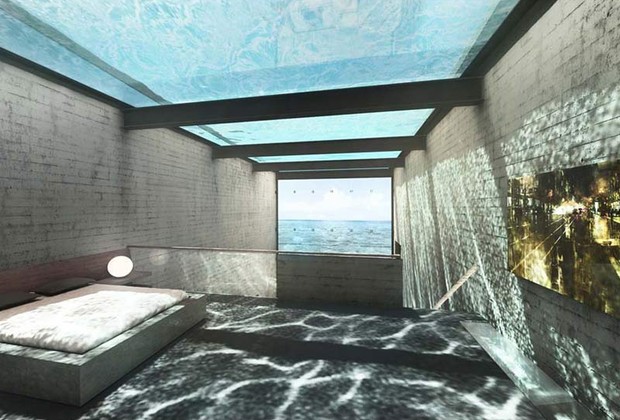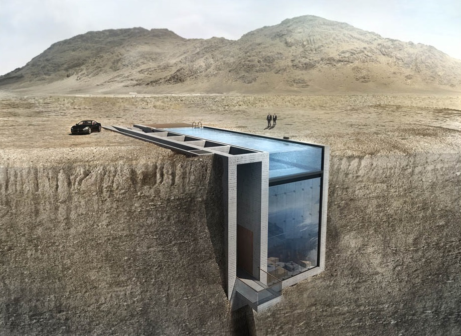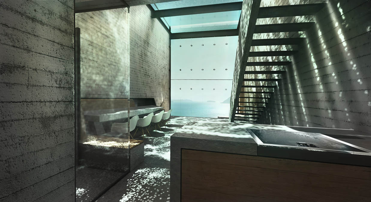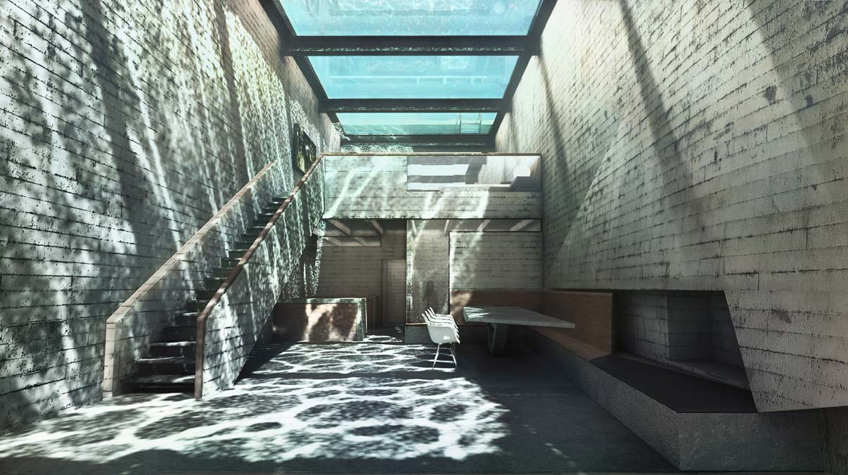 Laertis Antonios Ando Vassiliou e Pantelis Kampouropoulos, sócios do escritório OPA (Open Platform for Architecture), desenvolveram o projeto como “uma homenagem poética ao Brutalismo puro”. A piscina no teto, ao nível da superfície, e as paredes de vidro ajudam a iluminar e tornar mais fresco todo o interior.