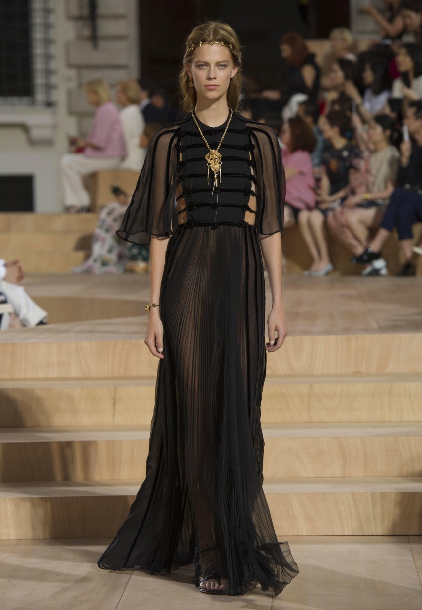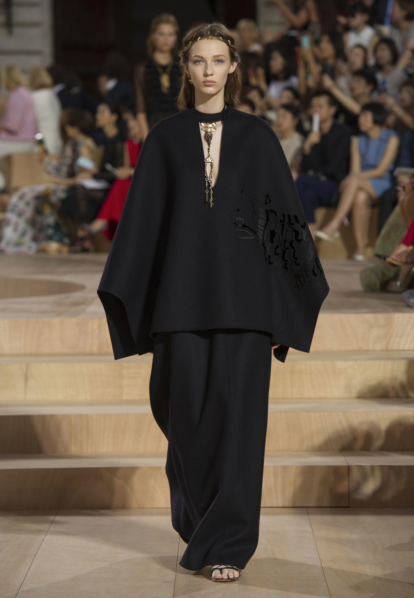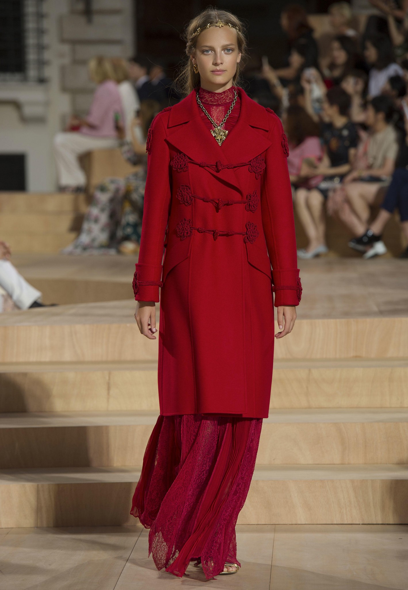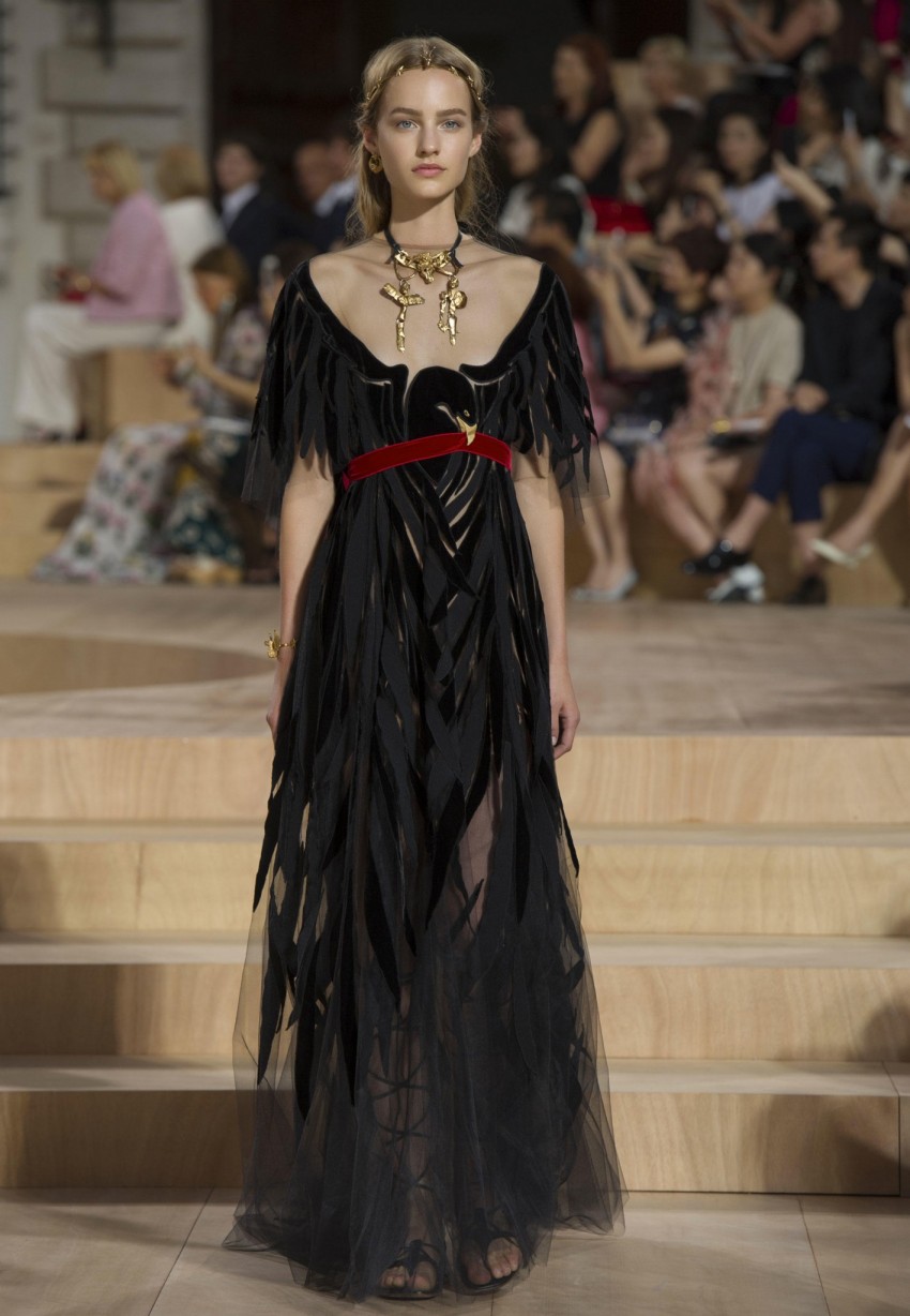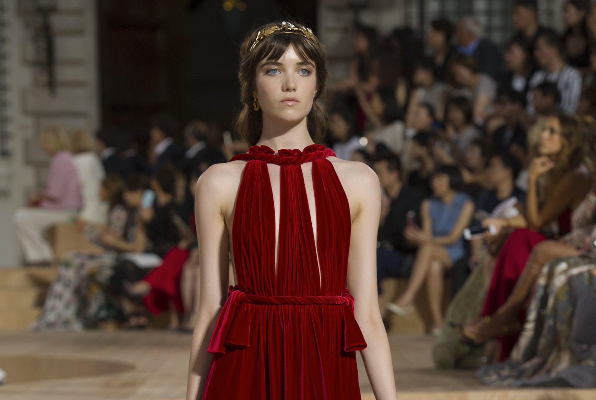Batizada de “Mirabilia Romae”, a coleção tem vários looks em preto: capas, transparências, faixas de renda e sandálias à gladiador – tudo arrematado com acessórios dourados de Alessandro Gaggio. Depois foram apresentadas as peças em vermelho – a cor-fetiche da Valentino – com mais patchworks que lembram mármore.