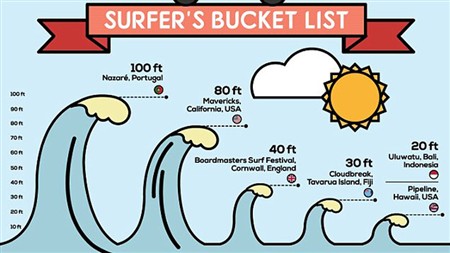 A lista inclui outros locais para surfar com características diferentes, como o Pipeline, no Havai, conhecido pelos perigos das suas ondas.