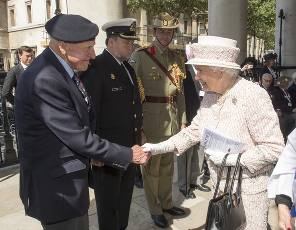 Isabel II, de 89 anos, acompanhada do marido, o príncipe Felipe de Edimburgo, assistiu no sábado, dia 15, à cerimónia religiosa na igreja de St. Martin-in-the-Fields, em memória dos cerca de trinta mil soldados do Reino Unido que morreram na campanha militar contra o Japão.