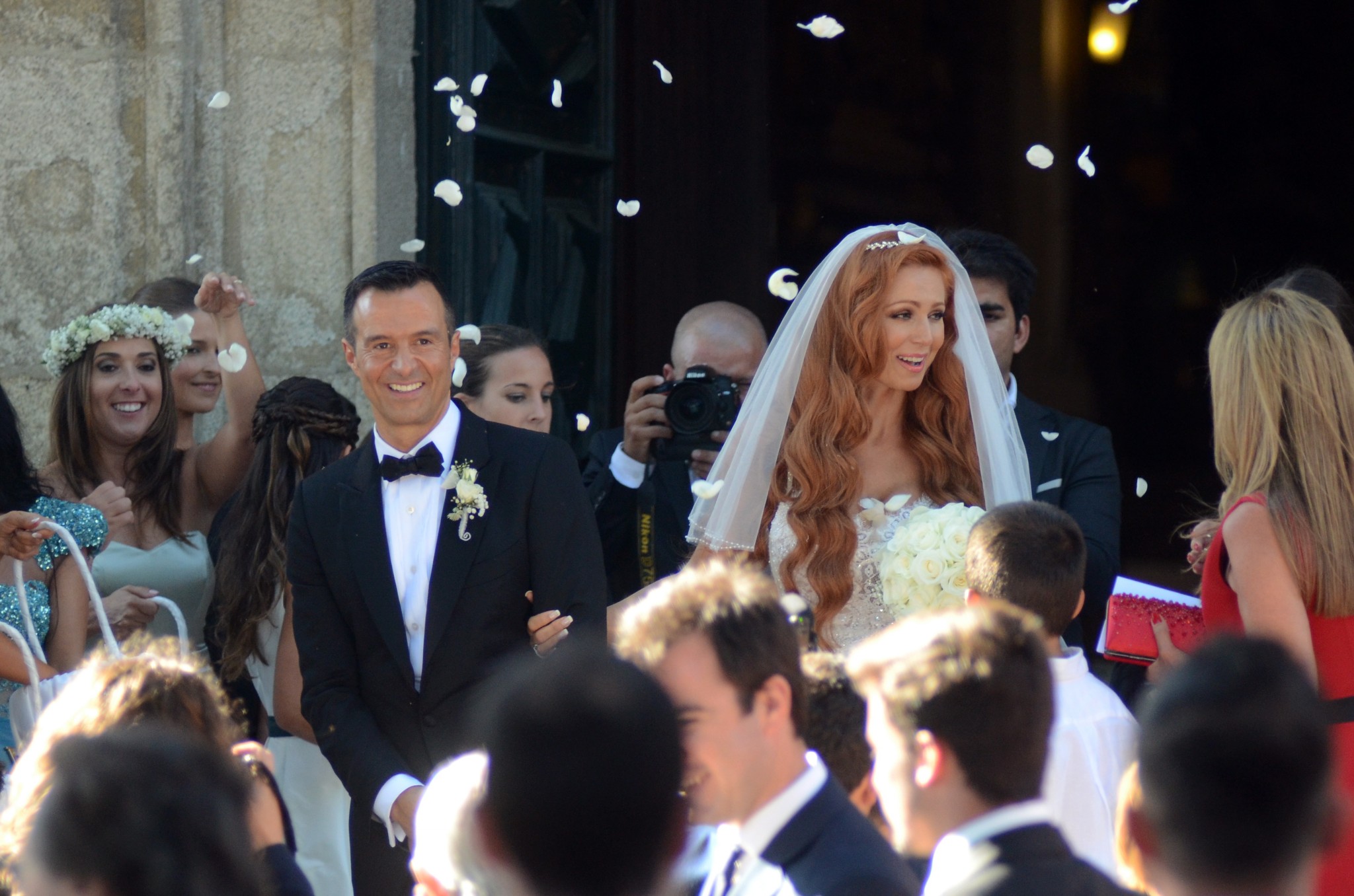 Em conformidade com a decoração da igreja, o bouquet era composto por rosas brancas, as mesmas que irão figurar no suntuoso bolo de noiva de vários andares, com quase um metro de altura.