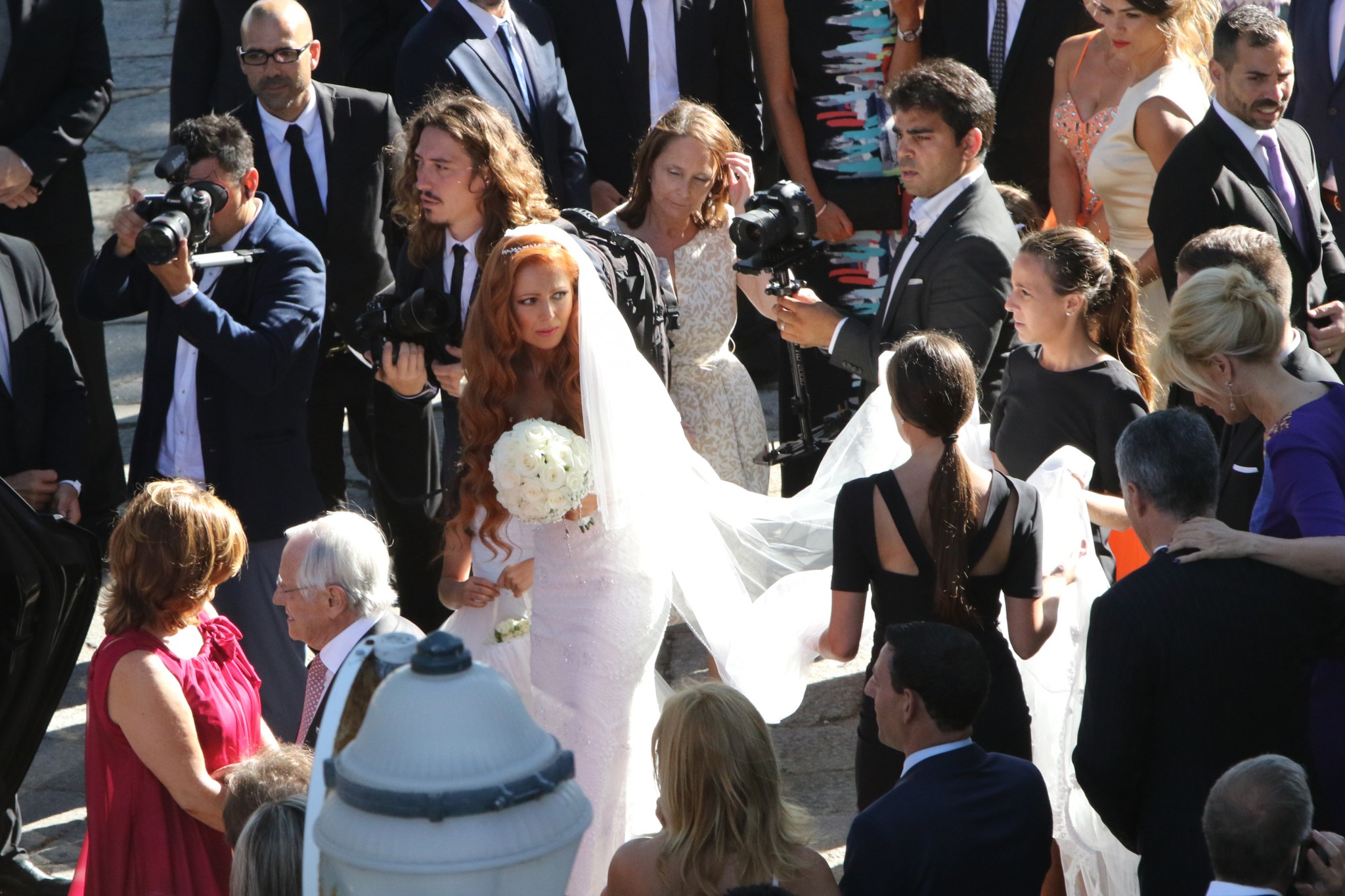 Sandra Mendes usou ainda um longo véu, também ele branco. Quanto ao penteado a noiva optou por usar os cabelos ruivos soltos e uma tiara.