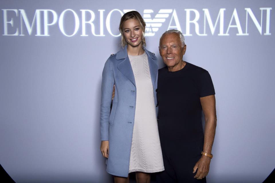 Apaixonada por moda, Beatrice não quis perder as tendências de moda e principalmente as propostas de Giorgio Armani, um dos seus estilistas preferido, que criou o vestido de noiva que usou na cerimónia religiosa. No final do desfile, a mulher de Pierre posou sorridente ao lado do estilista.