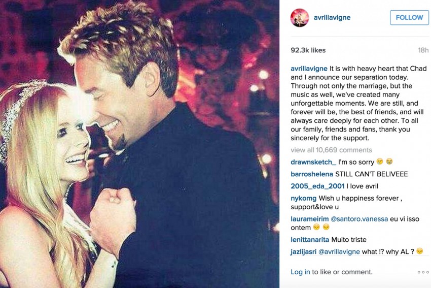 “É com o coração pesado que eu e o Chad anunciamos a nossa separação. Através do casamento, mas também da música, criámos momentos inesquecíveis. Ainda somos, e vamos ser sempre, os melhores amigos e vamo-nos preocupar eternamente um com o outro. À nossa família, amigos e fãs, obrigada pelo vosso apoio”, escreveu a artista canadiana.