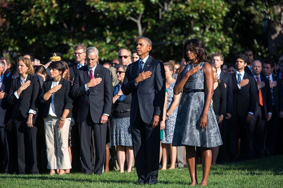 O presidente dos Estados Unidos, Barack Obama, e a primeira-dama, Michelle Obama, juntaram-se ao funcionários da Casa Branca para um minuto de silêncio, no sentido de recordar as vítimas do ataque terrorista do 11 de setembro. Esta sexta-feira, dia 11, cumpre o 14º aniversário do atentado.