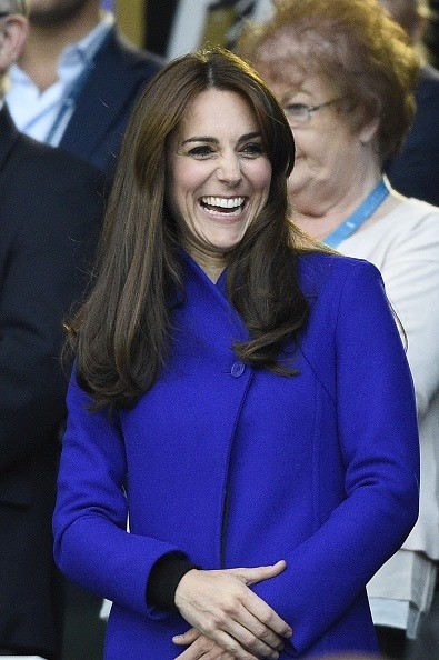 Para esta ocasião, a duquesa optou por usar um casaco azul elétrico da marca Reiss (da coleção outono/inverno 2014).