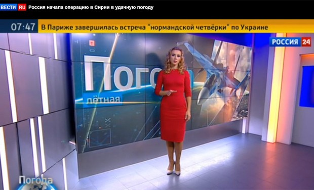 Durante as previsões meteorológicas transmitidas no telejornal da emissora pública russa Rossiya 24, a apresentadora disse que outubro é “um ótimo mês” para sobrevoar a Síria e prosseguir com os bombardeios.