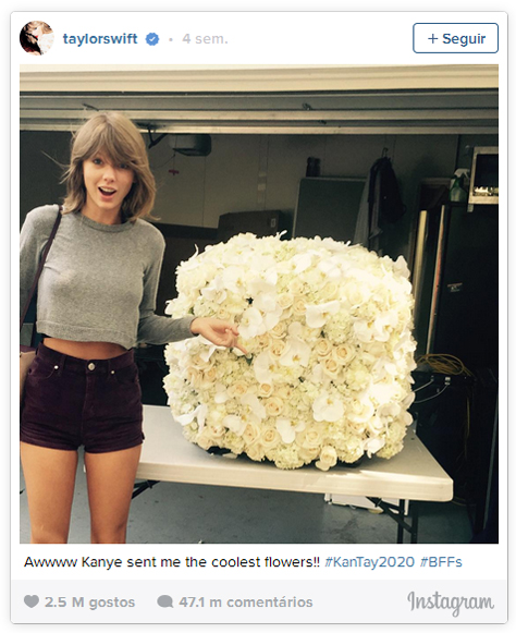Claro que Taylor Swift também surge nesta lista, ou não fosse a personalidade com mais seguidores, não uma, mas duas vezes. Em segundo surge a imagem da cantora ao lado de um ramo de flores enviado por Kanye West. No terceiro posto está a foto de Taylor às cavalitas do namorado, o DJ Calvin Harris.