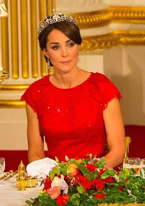 A duquesa de Cambridge vestiu-se de vermelho e de diamantes para o seu primeiro jantar de Estado, desde que casou com o príncipe William em 2011.