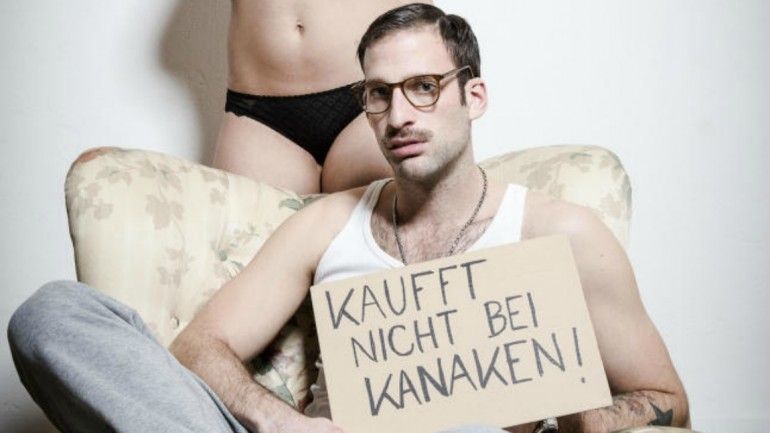 Na imagem, Olli Waldhauer surge em primeiro plano sentado numa poltrona e com um cartaz castanho onde se pode ler em alemão “Kaufft nicht bei Kanaken” (Não compres nos [nas lojas] estrangeiros). O termo “kanaken” é uma gíria depreciativa para chamar em alemão os imigrantes turcos e que, neste caso, combina com um slogan bem conhecido dos tempos do nazismo. Atrás está uma mulher, que veste apenas umas cuecas pretas, com o peito à mostra e numa posição provocadora.