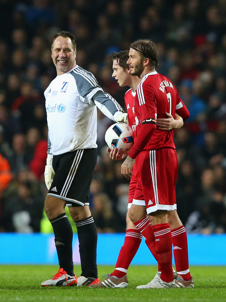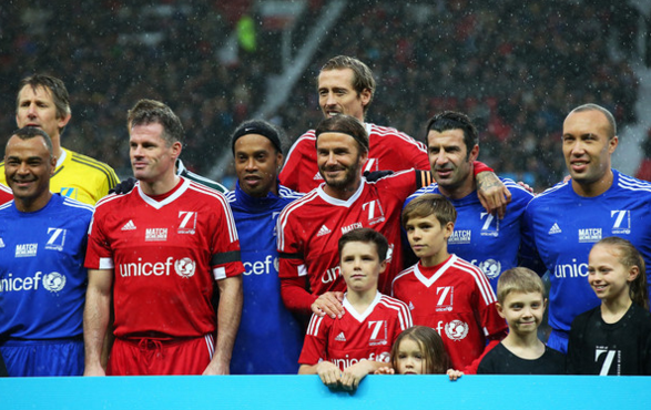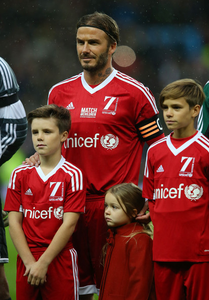 Brooklyn, de 15 anos, Romeo, de 13, Cruz, de 10, e Harper, de 4, foram apoiar o pai no jogo solidário, a favor da UNICEF, no sábado, dia 15, que decorreu em Old Trafford. Em campo estiveram grandes estrelas do futebol mundial, entre elas o português Luís Figo.