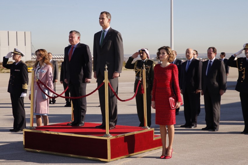 Rania, acompanhada do marido, o rei Abdullah, chegou esta quinta-feira, dia 19, a Madrid, onde o casal vai realizar uma visita de trabalho. À sua espera, os reis tinham Letizia e Felipe, que os receberam calorosamente no aeroporto.